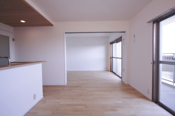夫婦2人の暮らしに合わせてのリフォーム LDKと寝室を続き間にしてワンルーム的にも使えるようにした 壁はローラーしっくい塗り、床は既存のフローリングの上に天然木フローリングを敷いた 寝室の奥にはウォークインクローゼットを設けている